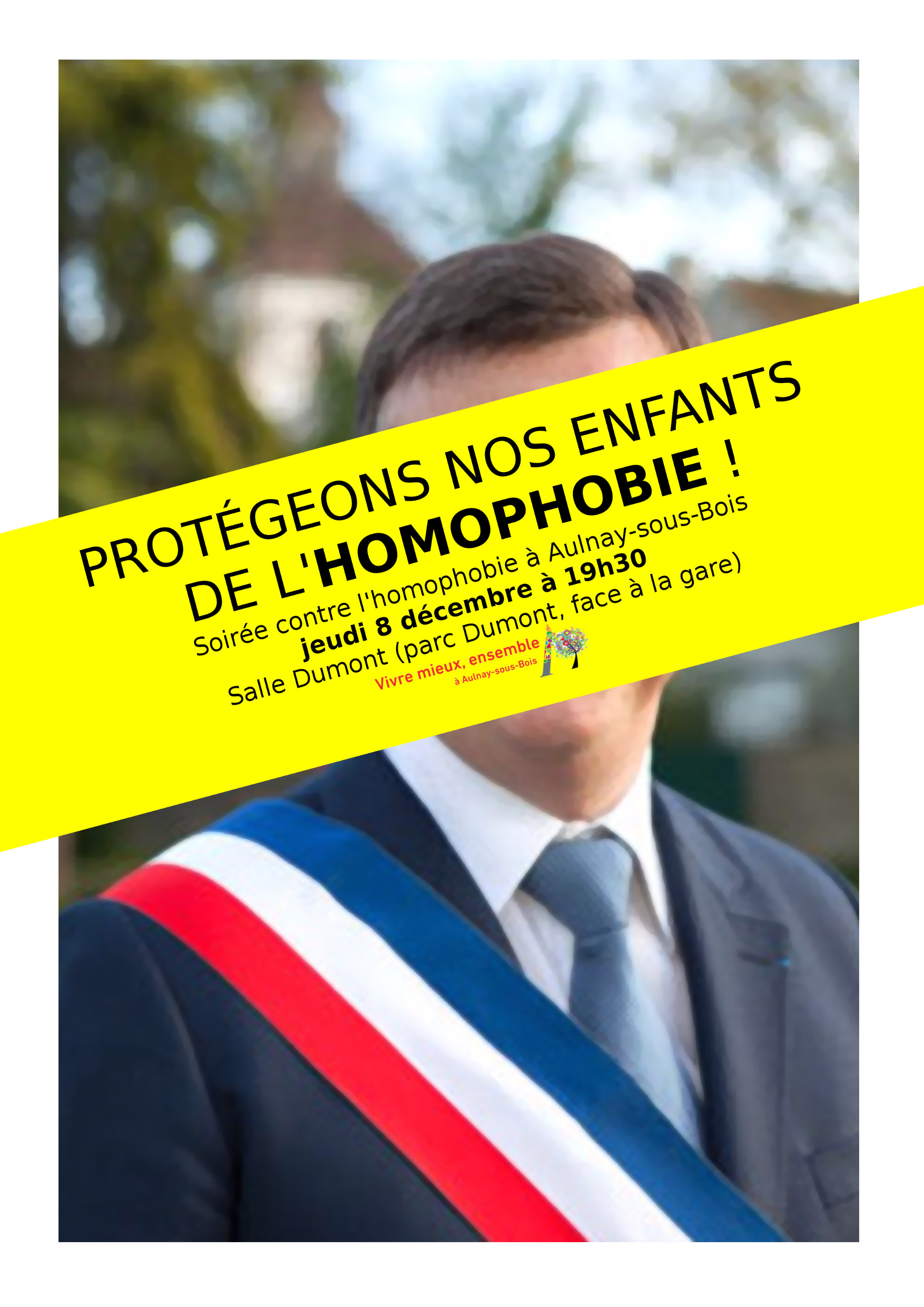 Nous refusons que notre ville devienne le symbole de la discrimination ! Nous proposons donc une soirée contre l’homophobie le jeudi 8 décembre 2016 à 19h30, à Aulnay-sous-Bois (salle Dumont, parc Dumont, face à la gare RER). Nous devons porter ensemble des actions fortes pour faire cesser ce climat homophobe, cause d’insécurité.*