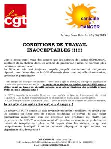 Dans ce courrier, vous exposez les mesures exceptionnelles que vous avez prises mais nous vous faisons remarquer qu’elles sont intervenues seulement après que des membres de la CGT aient fait des relevés de températures (de 30 à 37°) et les aient envoyés à la DG et l’Inspection du travail) et c’est donc bien trop tard que « quelques mesurettes » ont été envisagées, celles-ci ne permettant pas aux salariés de se protéger de la chaleur suffocante (salle peu climatisée, bouteille d’eau interdite dans les ateliers).