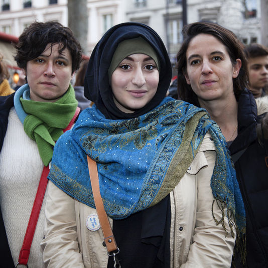 En venant à la manifestation, en métro, Yousra Haddouche, lycéenne de 18 ans, a entendu des commentaires peu avenants sur les musulmans. « Quelqu’un a dit ’’Ces musulmans, ils sont contre la liberté’’. Ça m’a fait mal, confie-t-elle, car je suis Française avant d’être musulmane. » Yousra est venue avec deux professeures de son lycée d’Aulnay-sous-Bois, Mathilde Levesque et Marion Alline. Son but : « défendre la liberté, pilier fondamental de notre société et s’opposer à l’islamophobie. » « Beaucoup de gens font l’amalgame entre musulmans et terroristes, regrette-t-elle. Mais je suis ici comme Française et comme musulmane. A cause de ce qui s’est passé, il va y avoir une vague d’islamophobie. Nous, musulmans, nous devons essayer de calmer ces tensions jusqu’à ce qu’elles s’apaisent. Nous devons être présents sur les réseaux sociaux, et manifester. Islam, ça veut dire paix en arabe. »