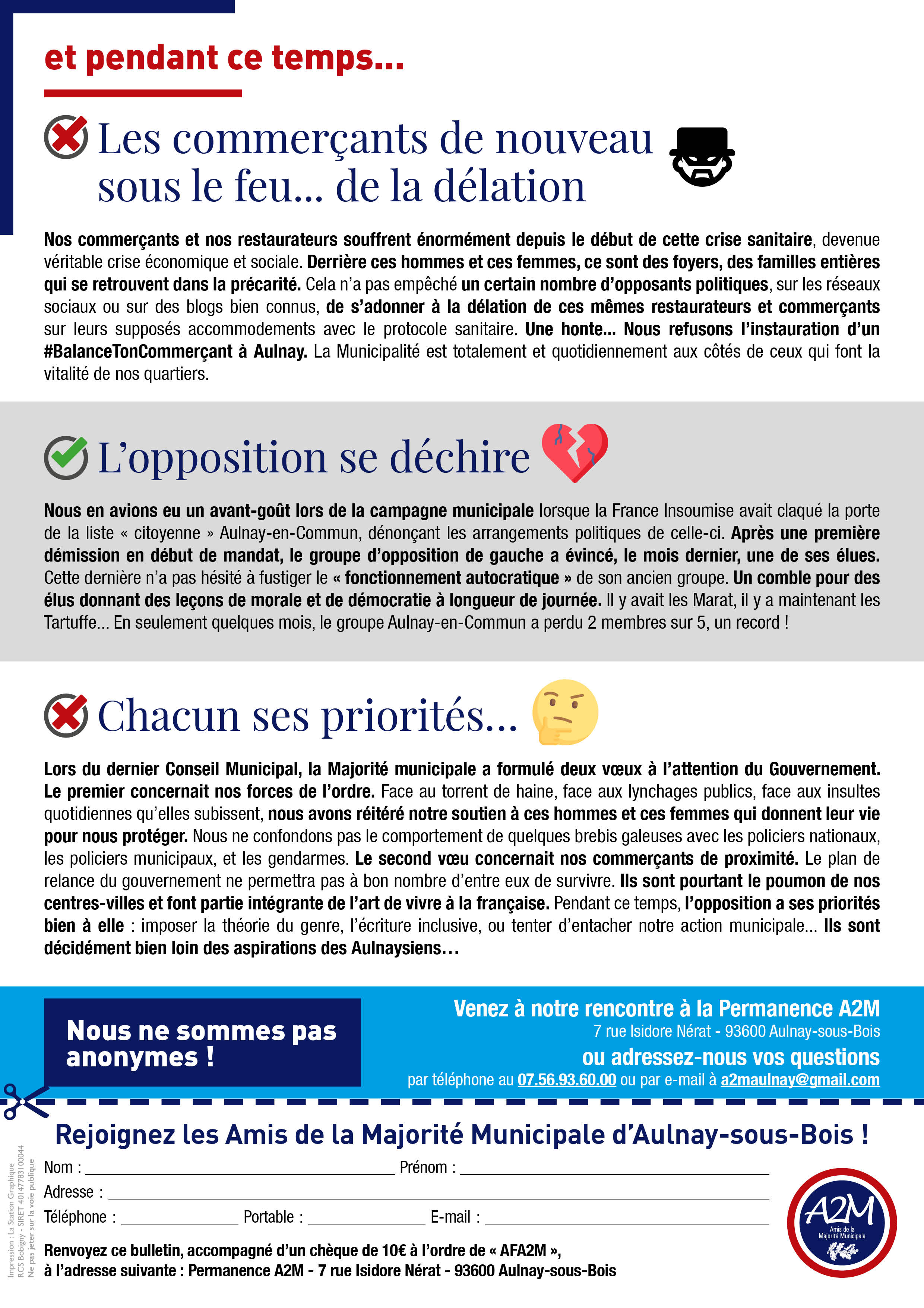 Sur d’autres registres factuels, A2M se rie des difficultés de son principal groupe d’opposition Aulnay En Commun (départ forcé de Sylvie Billard qui affirme que les élus du groupe d’opposition agissent de manière autoritaire et peu démocratique, un comble pour un groupe qui crie haut et fort son désir de démocratie). Egalement, force est de constater que l’écriture inclusive semble une priorité pour Aulnay En Commun, là où de nombreux Aulnaysiens ont du mal à joindre les deux bouts et ne peuvent pas partir en vacances. A chacun ses priorités…