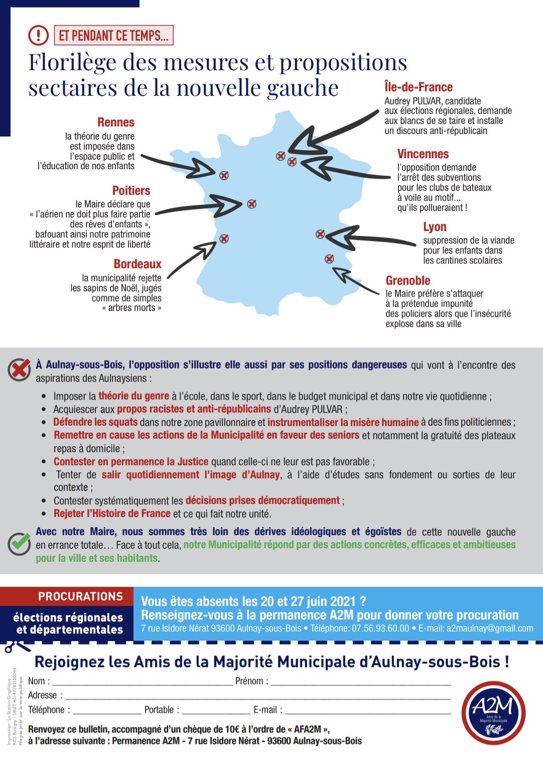 Ce n’est pas nouveau mais le procédé reste toutefois choquant : l’association A2M proche de Bruno Beschizza distribue un tract très critique sur l’alliance de Gauche notamment pour la région Île-de-France. On y voit encore une allusion à la théorie du genre mais aussi sur le déploiement des salles de shoot. Que ce soit à Gauche ou à Droite, la soupe est bonne et tous les moyens sont bons pour discréditer l’autre. Qui est le responsable de l’abstention ?