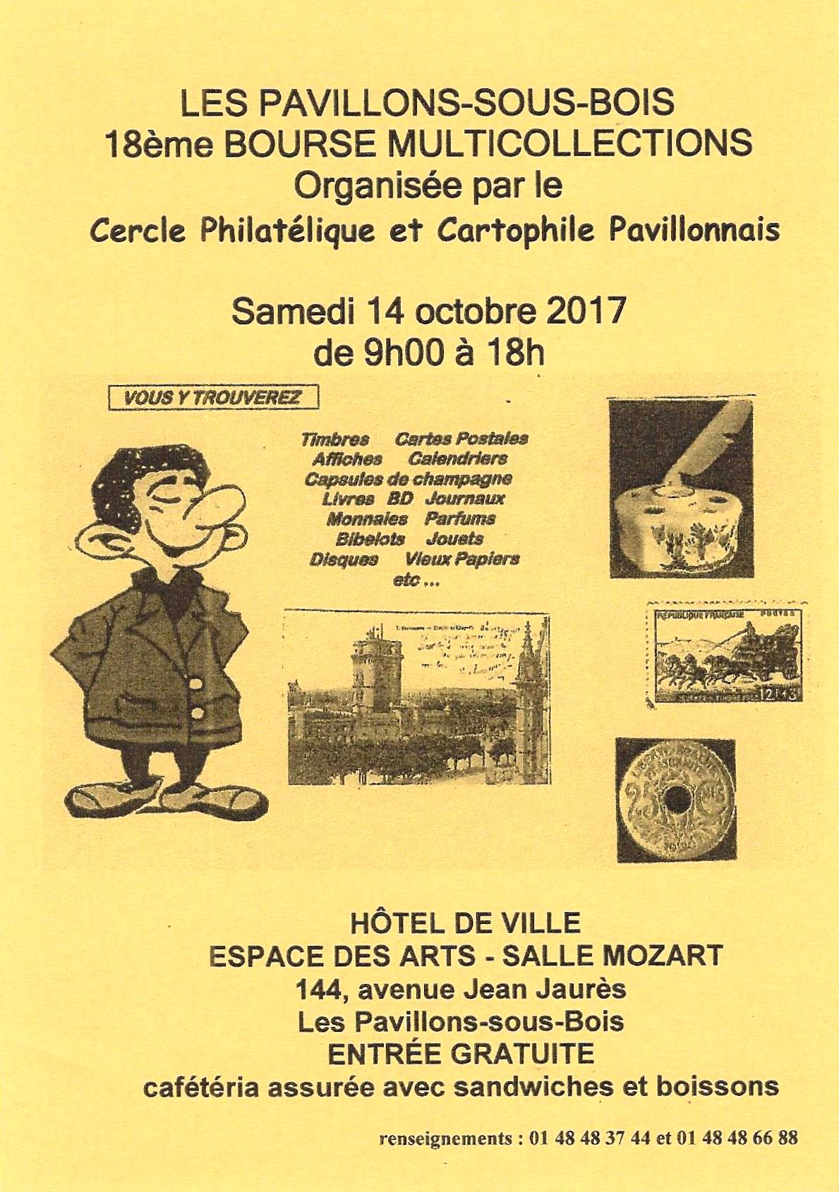 Le Cercle Philatélique et Cartophile Pavillonnais organise sa 20ème bourse multicollections le samedi 12 octobre de 9h à 18h à l’hôtel de ville des Pavillons-sous-Bois (Espace des Arts – Salle Mozart – 144 Avenue Jean-Jaurès).