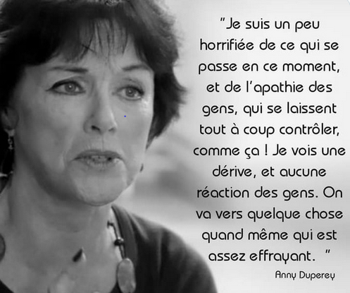 Je suis réconfortée quand je découvre des êtres humains qui n’ont rien perdu de leur sens critique, de leur discernement, et surtout qui ont le courage de dire haut et fort que le régime qui nous est imposé n’a plus rien d’humain ni de fraternel et qu’il est même contraire aux droits humains et citoyens ! Je suis tout autant horrifiée que vous madame Duperey et très inquiète du régime totalitaire dans lequel nous nous sommes engagés, à cause de gens qui ont renoncé aux libertés et droits acquis dans le sang par nos ascendants pour une illusoire sécurité sanitaire !