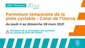Dès jeudi 4 mars et pour une durée de 3 semaines, la piste cyclable du Canal de l’Ourcq sera fermée au niveau du Pont de l’Union afin d’effectuer un remplacement des gardes corps. Pour des raisons de sécurité, ces travaux nécessiteront une déviation de la circulation des cyclistes pendant toute la durée du chantier via l’avenue des Rosiers. Le passage des piétons restera néanmoins possible.