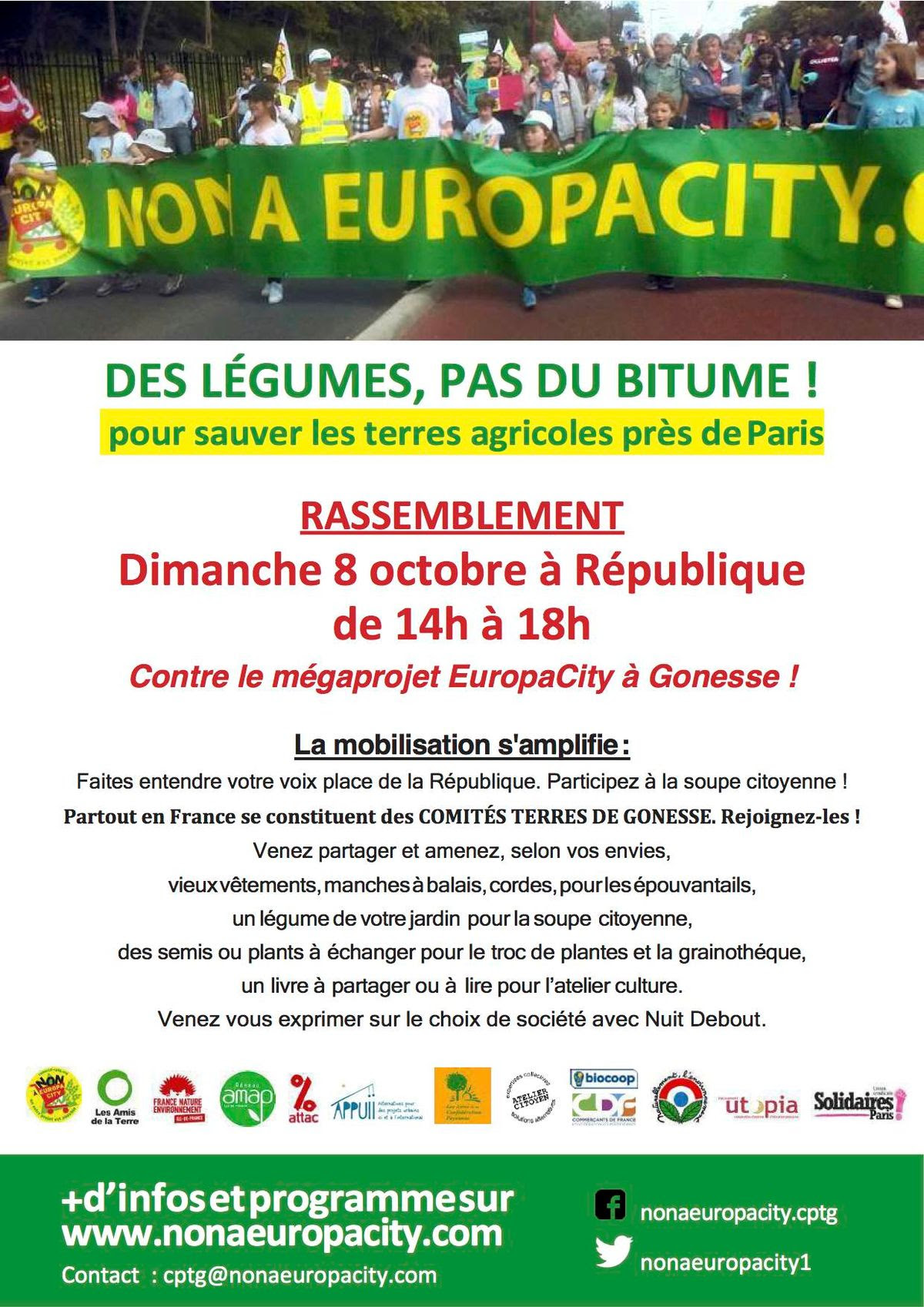 Indignés par la décision des pouvoirs publics de passer outre l’avis défavorable émis à l’issue de l’enquête publique sur le projet démesuré de centre commercial et de loisirs EuropaCity, des citoyens, des associations et des collectifs professionnels se rassemblent dimanche 8 octobre place de la République, à Paris, pour défendre un projet alternatif permettant à la fois de préserver le patrimoine agricole de la Plaine de France et de créer des emplois dans les métiers de la transition écologique.
