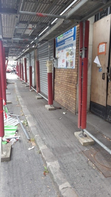 Rue Julien Mira, un échafaudage apparemment posé au frais de la municipalité depuis 2016 encombre ce trottoir déjà étroit, sujet à de nombreux passages piétons vers la gare. Cet échafaudage créant également une zone très insalubre ne peut pas rester éternellement.