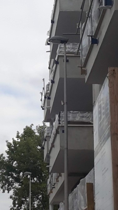 Rue Eugène Schueller, un immeuble en construction est déjà bien avancé, sur un trottoir trop étroit (1.20m de largeur utile donc en infraction avec la loi). Le promoteur a réussi l’exploit de placer des balcons entre deux candélabres (au moins les habitants auront l’éclairage gratuit sur leur terrasse) un comble pour une rue déjà étroite et sans trottoir coté de l’usine L’Oréal.
