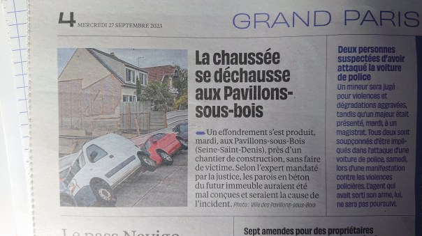 Nous vous l’évoquions dans un précédent article. Une partie d’un trottoir aux Pavillons-sous-Bois s’est effondrée à proximité d’un chantier. Ci-dessous un extrait d’article qui montre les dégâts et les voitures impliquées. Merci à Géraldine pour cet extrait.