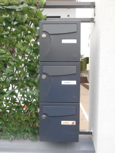 La clôture n’est pas doublée de haie vive comme prescrit dans le PLU, mais comporte un treillis artificiel de feuilles en tissu plastifié ( photo ci-dessous ) et 3 boîtes aux lettres pour combien de logements et de familles entassées en réalité sur cette petite unité foncière ? Le balcon proéminent qui figurait sur la façade sud est désormais exhibé sur la façade nord donnant sur la rue et sert à sécher quotidiennement le linge…. Une riveraine privée désormais de vue, de lumière, de soleil et de ciel affirme se croire vivre désormais au » bled » !