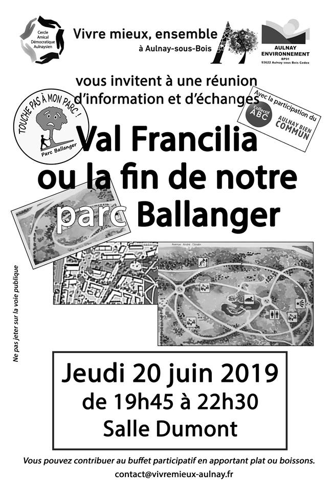 Réunion Vivre Mieux Ensemble à Aulnay-sous-Bois le 20 juin concernant la destruction du parc Ballanger