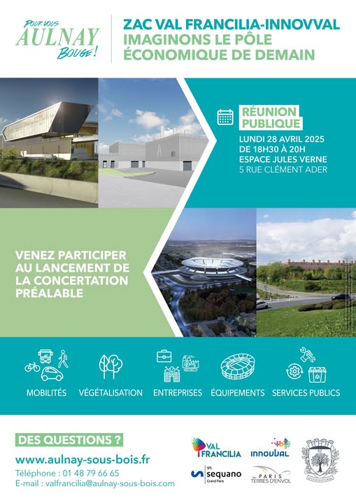 Dans le cadre de la création à venir de la ZAC (Zone d’Aménagement Concerté) Val Francilia-InnovVal, la Ville d’Aulnay-sous-Bois et le Territoire Paris Terres d’Envol organisent une concertation préalable de la population du 28 avril au 14 juin 2025.
