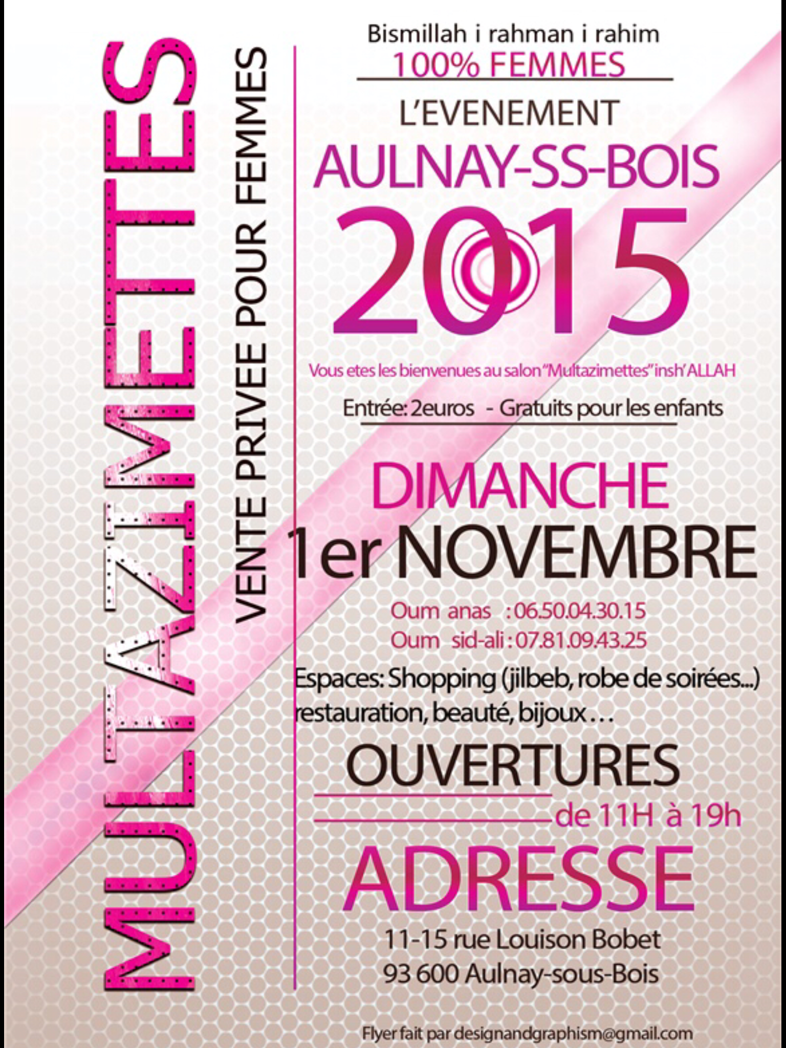 Nouveau rebondissement concernant la vente privée 100% femmes à Aulnay-sous-Bois : si nous connaissions le lieu de l’évènement (11h00 à 19h00 au 11-15 rue Louison Bobet, quartier de la Rose des Vents), la date elle vient de changer : veuillez noter dans vos agendas que la vente privée se tiendra finalement le dimanche 1er Novembre.