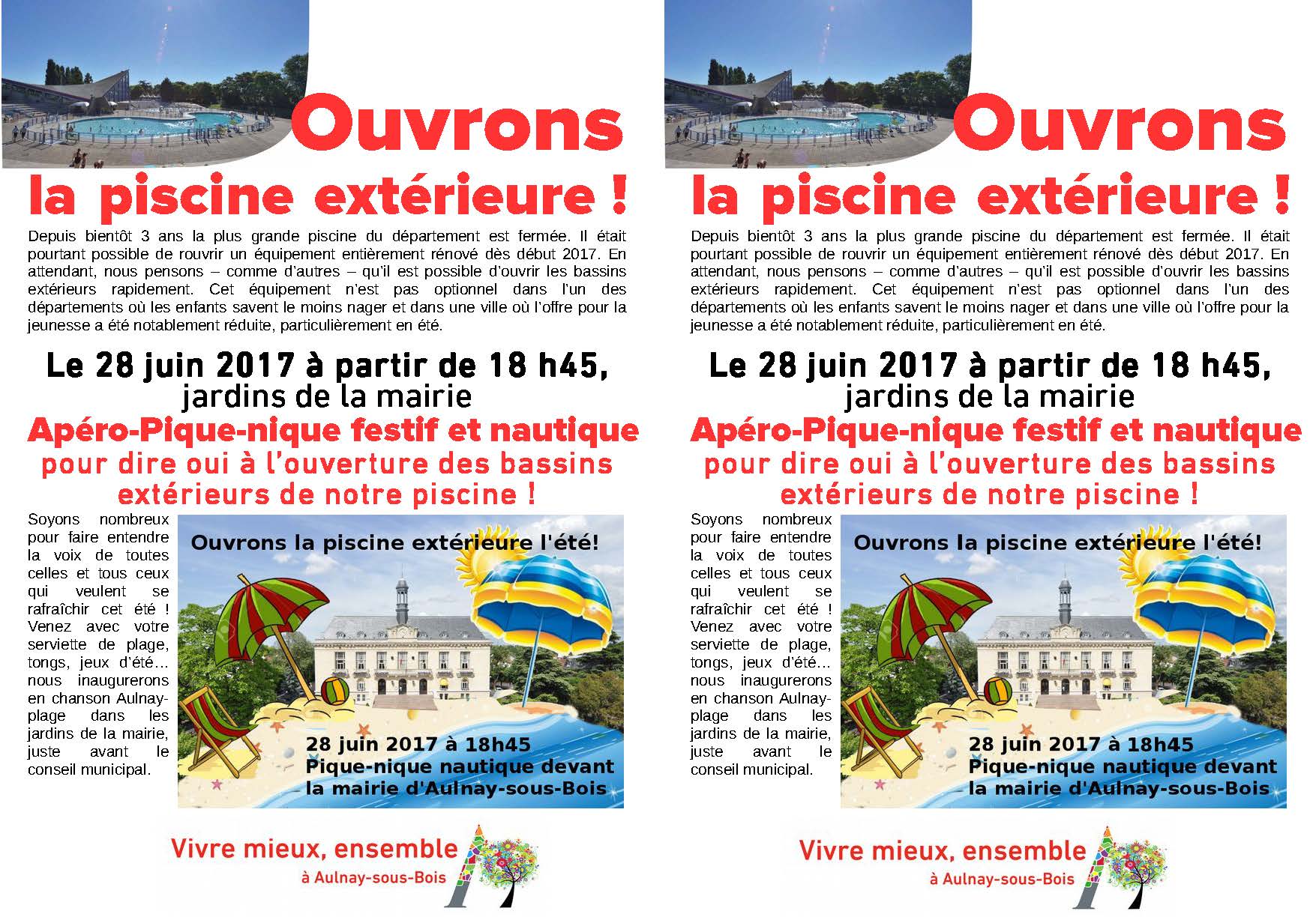 Il a fait chaud, et les nerfs sont à vif. L’association VME l’a bien compris, et souhaite capitaliser sur l’exaspération d’une partie de la population Aulnaysienne pour mobiliser le maximum de personnes et manifester au travers d’un pic-nique festif et nautique devant la Mairie. Objectif avéré : ré-ouvrir les bassins extérieurs du centre nautique de Coursaille, quartier Tour Eiffel.